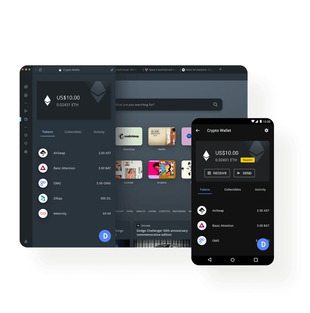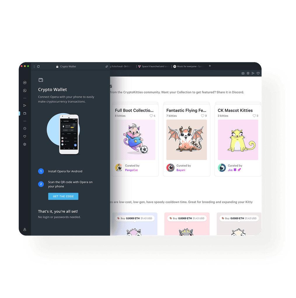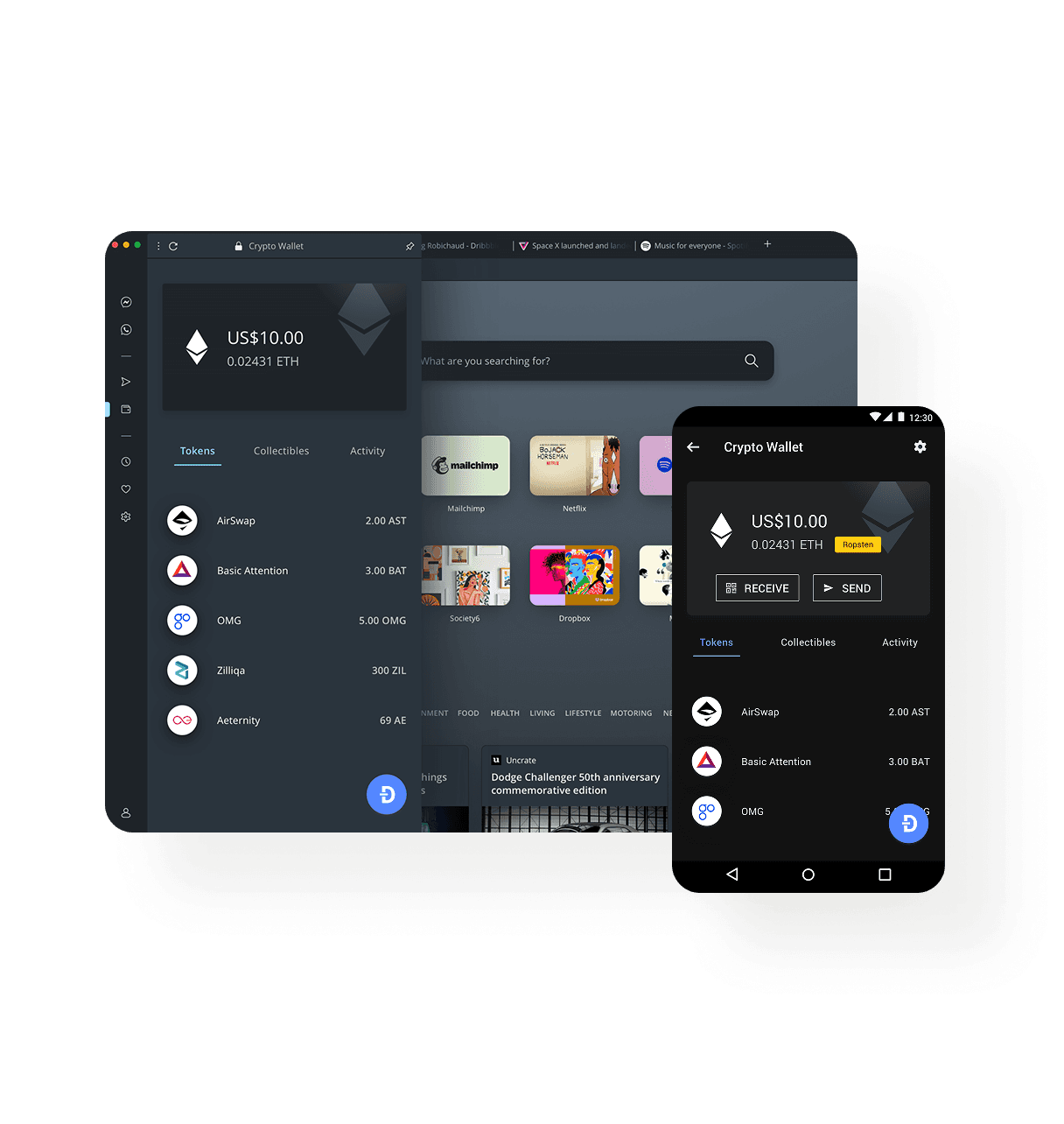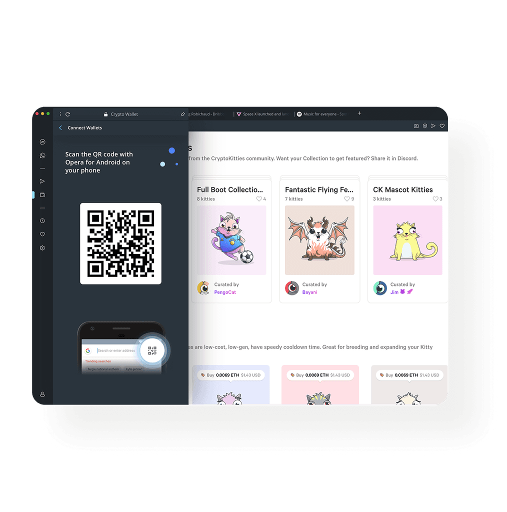 After positive feedback about crypto payments on mobile, I got a task to find an equally good solution for Opera users with PCs. Firstly, the desktop wallet needs to synchronize with its Android version, which supports Ethereum, tokens, and collectibles.