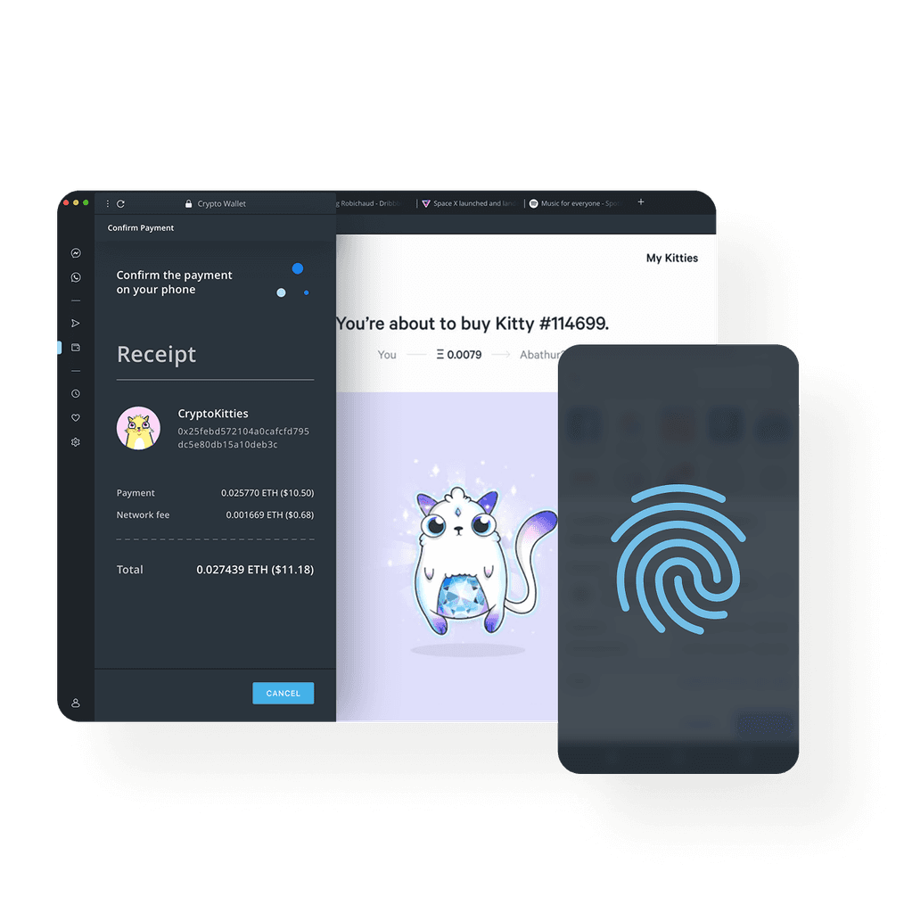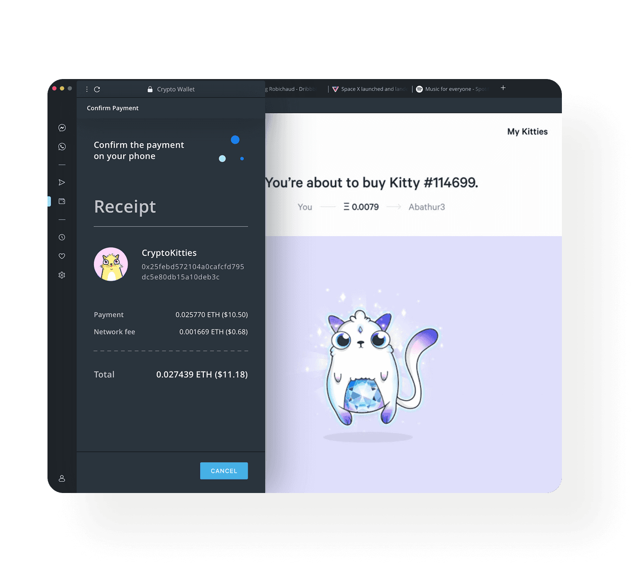 When a user wants to sign a payment, he can do it by clicking the “Buy” button on the desktop and then use a fingerprint reader on his phone, instead of typing a long passphrase. Although the whole transaction runs on the mobile side I decided to show users what is happening step by step with their payment in the desktop panel too.
