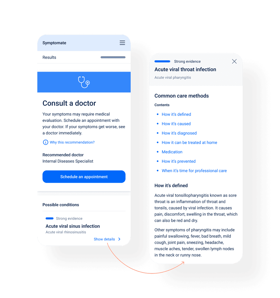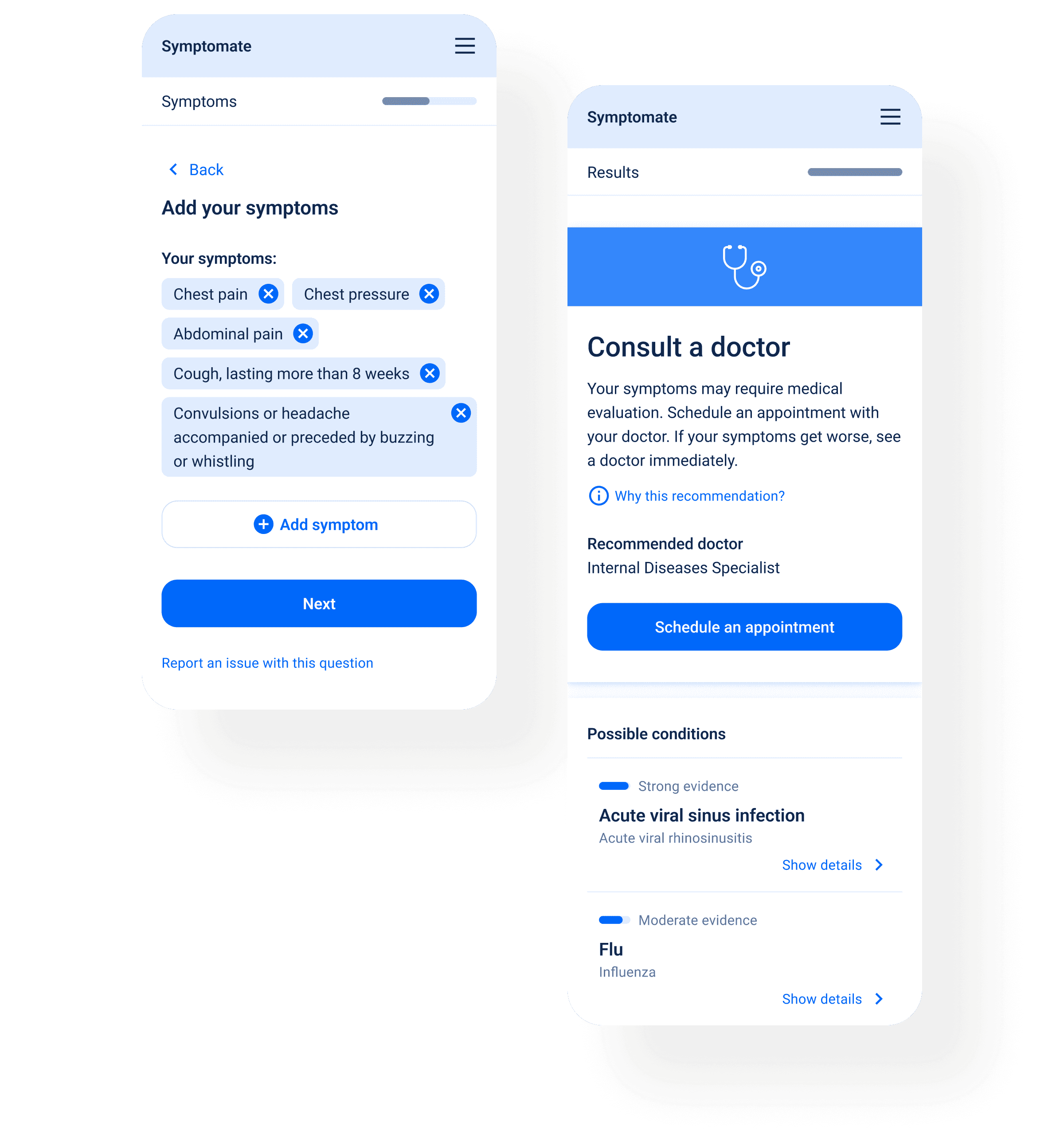 Symptomate is a symptom-checking app created by doctors and powered by AI. The app enables users to input their symptoms and receive analysis of possible medical conditions and relevant health recommendations.